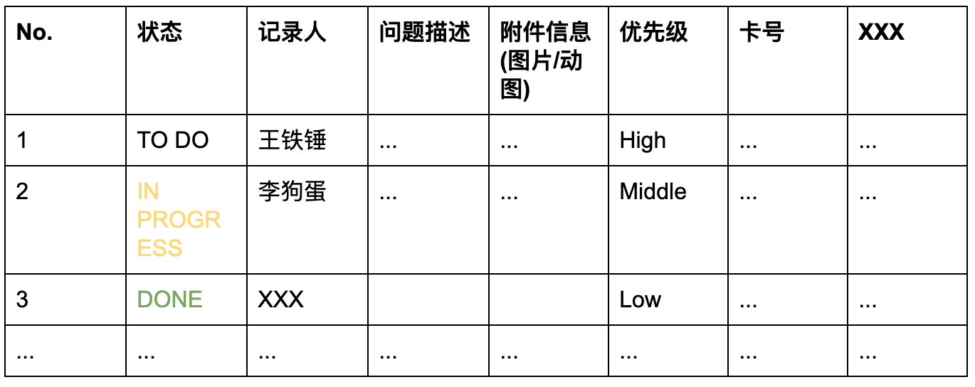 测试完成后,将所发现的问题逐个进行讨论,补全表格中空缺内容随后可直观的根据表格查看该Bug的状态和优先级。