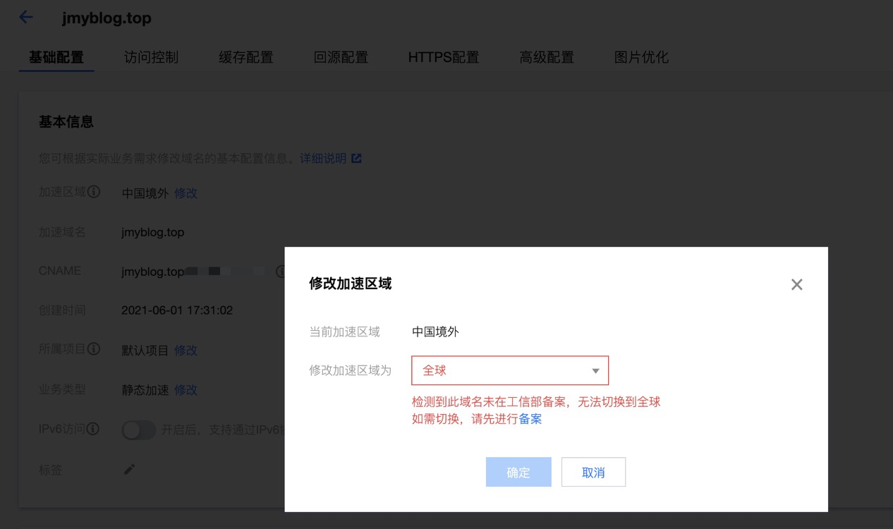 登录腾讯云,发现它对站点的加速和服务区域都是境外: