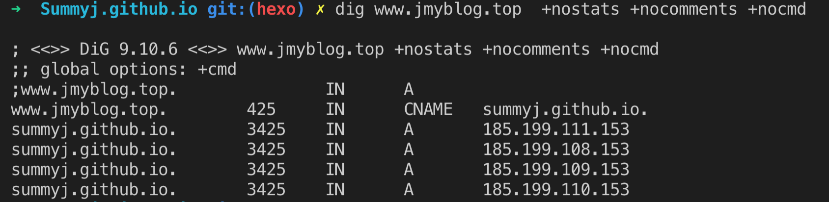 于是连接一个香港区域的VPN,然后再通过命令再次验证DNS设置,终于看到了指向CodingPages的信息和腾讯云签发的证书: