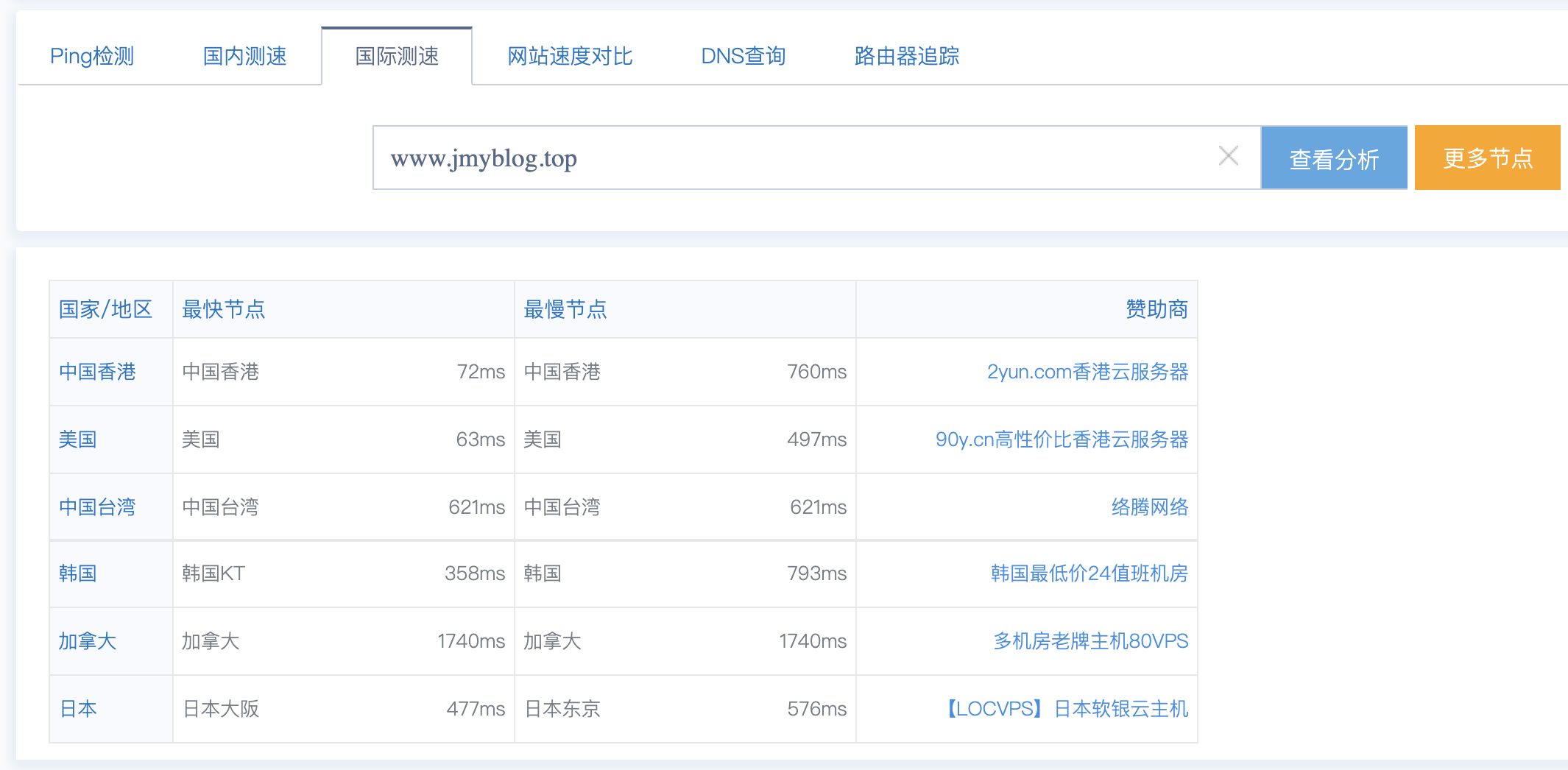 通过 这个网站 可以检测博客的访问速度,在国内测速 https://jmyblog.top ,国际测速 https://jmyblog.top 和 https://www.jmyblog.top , 结果都还不错: