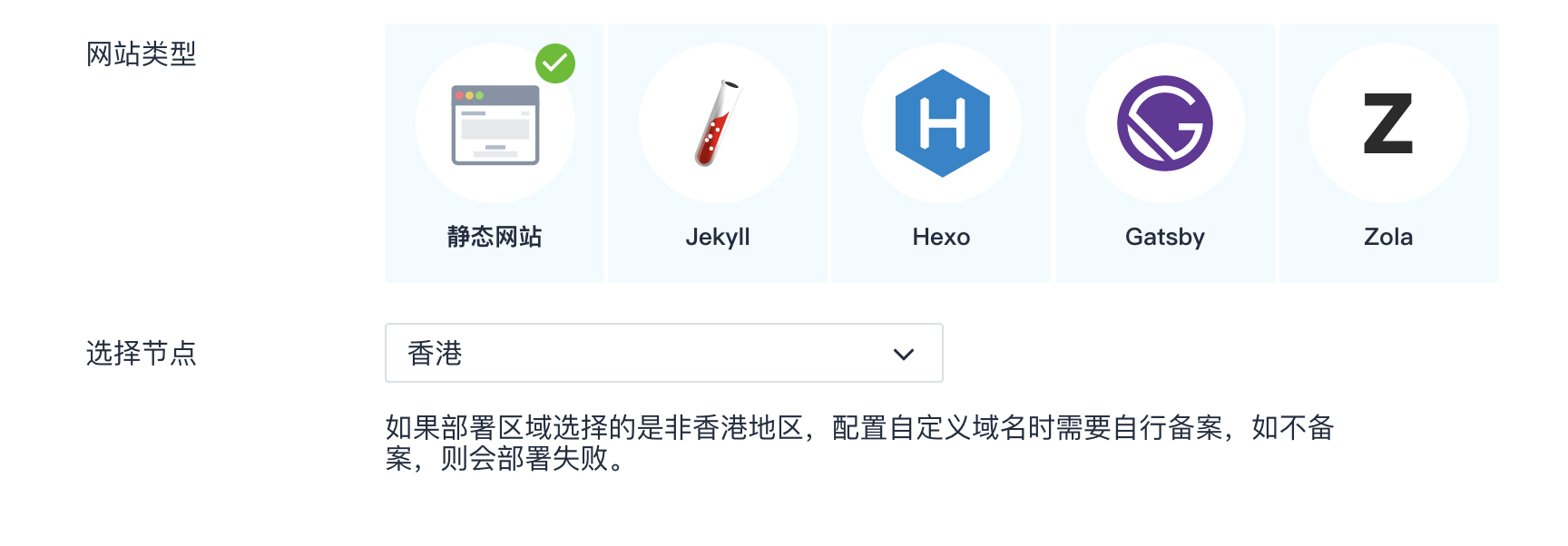 于是果断进入,选择相应的网站类型,最开始我选择了自己使用的Hexo,后来部署报错了,是因为我并没有把Hexo的配置文件上传到仓库(因为里面有许多我自己使用的插件私钥和密码,不能上传到public的仓库中)。所以后来又选择了静态网站,才部署成功: